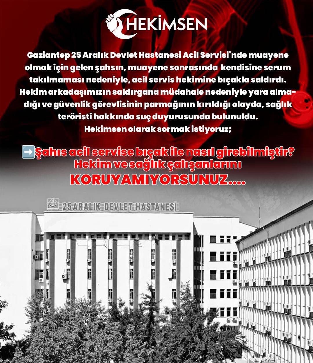 Sağlıkta şiddet bitmek bilmiyor!” Hekimsen Sendikası tarafından konu hakkında şu açıklama yapıldı, “Muayene olmak için gelen şahsın, muayene sonrasında kendisine serum takılmaması nedeniyle, acil servis hekimine bıçakla saldırdı. Hekim arkadaşımızın saldırgana müdahale nedeniyle yara almadığı ve güvenlik görevlisinin parmağının kırıldığı olayda, sağlık teröristi hakkında suç duyurusunda bulunuldu. Hekimsen olarak sormak istiyoruz; Şahıs acil servise bıçak ile nasıl girebilmiştir? Hekim ve sağlık çalışanlarını KORUYAMIYORSUNUZ….. Hastalar, hekimin muayene sonucu teşhisine göre tedavi uygulamasına müdahale edebilme lüksüne sahip olmuşlardır. Hasta memnuniyeti odaklı sağlık politikanız hastaların ŞIMARMASINA ve hekimlerimizin hastalarına uygulaması gereken tedavileri uygulayamamasına neden olmaktadır. Acil servisler, acil olan hastaların müdahalesi için kurulmuş birimlerdir. Acil olmayan hastaların Yeşil Alan adı altında kabul edilmesi, acil hastalara olan müdahalelerin gecikmesine neden olmaktadır. Acil servis yeşil alan KAPATILMALIDIR. Sağlık Bakanlığı’nın, hastane acil servislerinin amacına uygun kullanılmasını sağlayacak ve kamu binasında hekimlerimizi koruyacak yasal düzenlemeleri bir an önce hayata geçirmelidir” (BSHA – Bilim ve Sağlık Haber Ajansı)